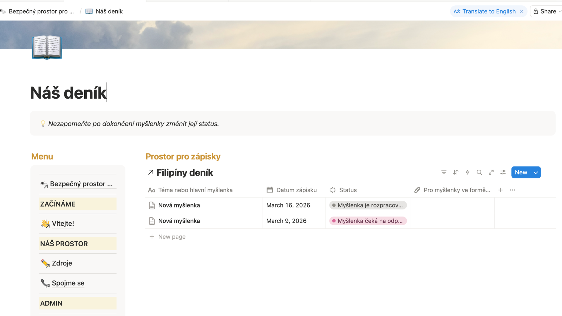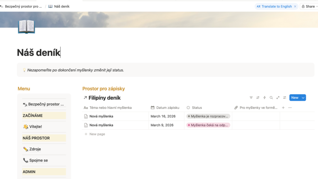 Deník běží v bezplatné a vizuálně čisté aplikaci Notion (je třeba se registrovat). Můžete do něj psát na počítači, nebo si stáhnout aplikaci do mobilu a mít ji tak po ruce prakticky pořád.